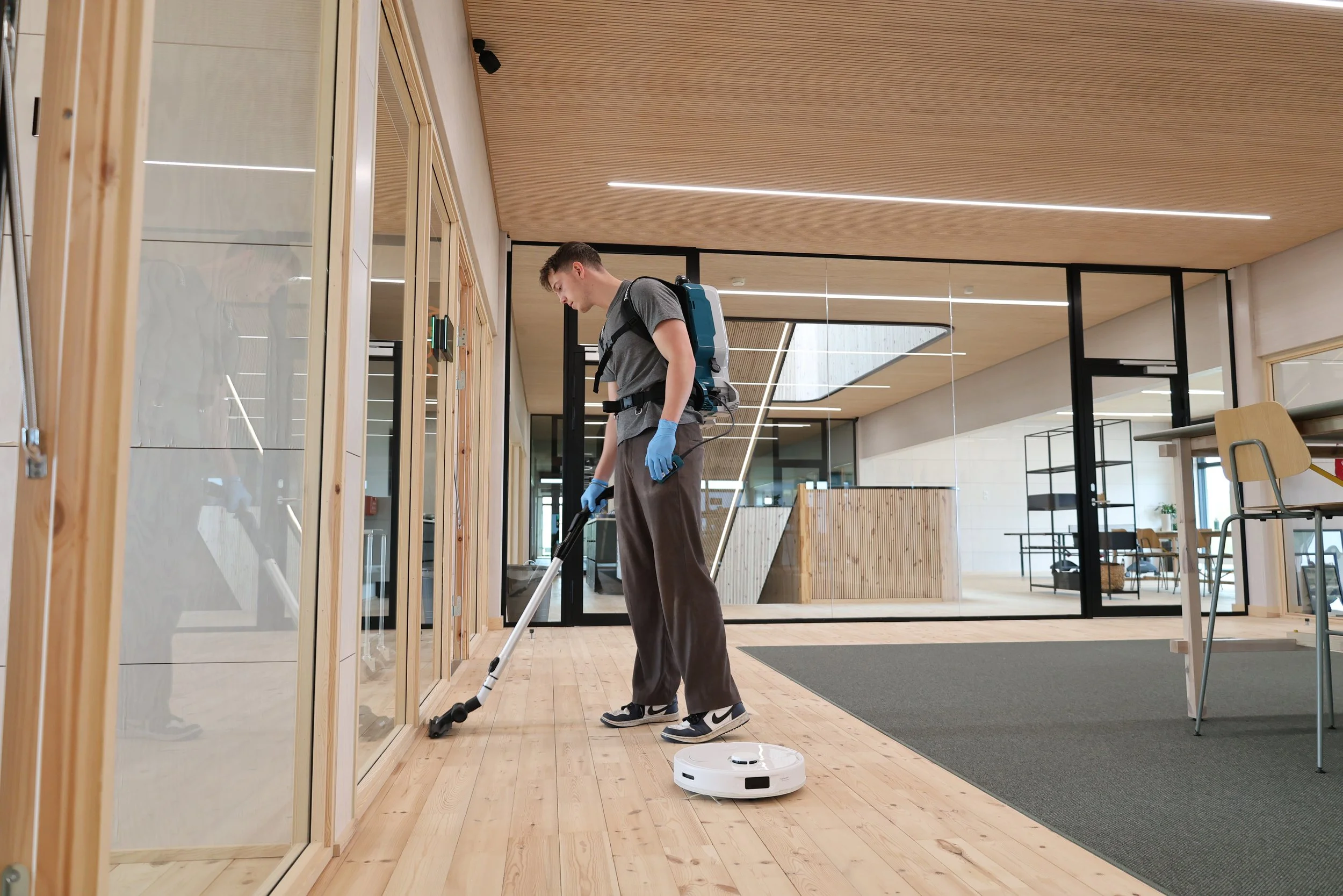 Rengøringsrobotter kan klare meget af arbejdet selv, men de mangler øje for detaljerne. Derfor bliver robottens opgaver altid tjekket af en medarbejder for at sikre, at alt er helt rent.